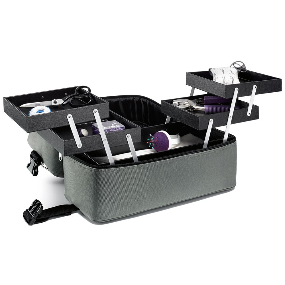 Romslig syboks for oppbevaring og transport av sytilbehør.