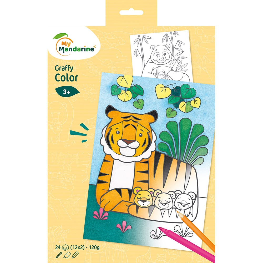 tilpasset barn fra 3 år. Boken inneholder 24 ark med 12 ulike